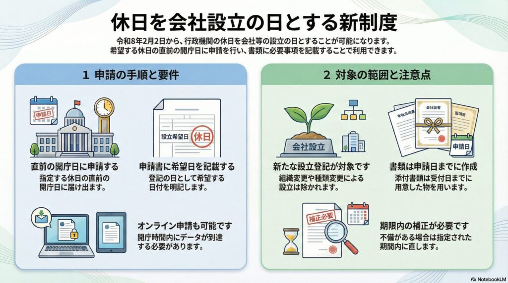 今回、制度が改正され、令和8年(2026年)2月2日からは、本来は法務局がの休みの日であっても、その日を会社設立の日とすることができるようになりました。